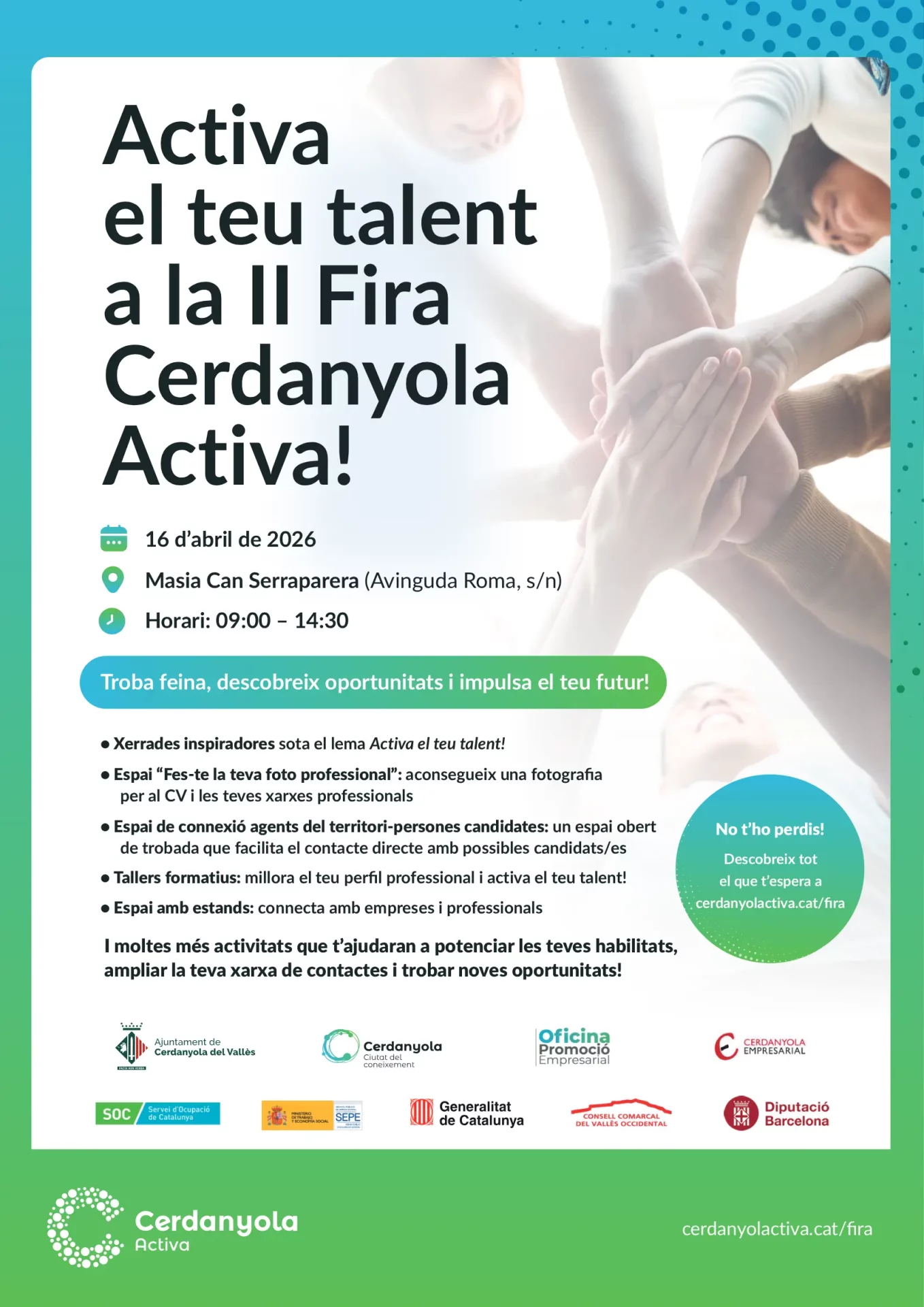Durant la jornada també es durà a terme un esmorzar empresarial, impulsat amb la col·laboració de Cerdanyola Empresarial, que vol afavorir la relació entre empreses del municipi i generar noves sinergies. A més, les persones assistents disposaran d’un servei de fotografia professional per millorar la seva imatge en currículums i perfils digitals.