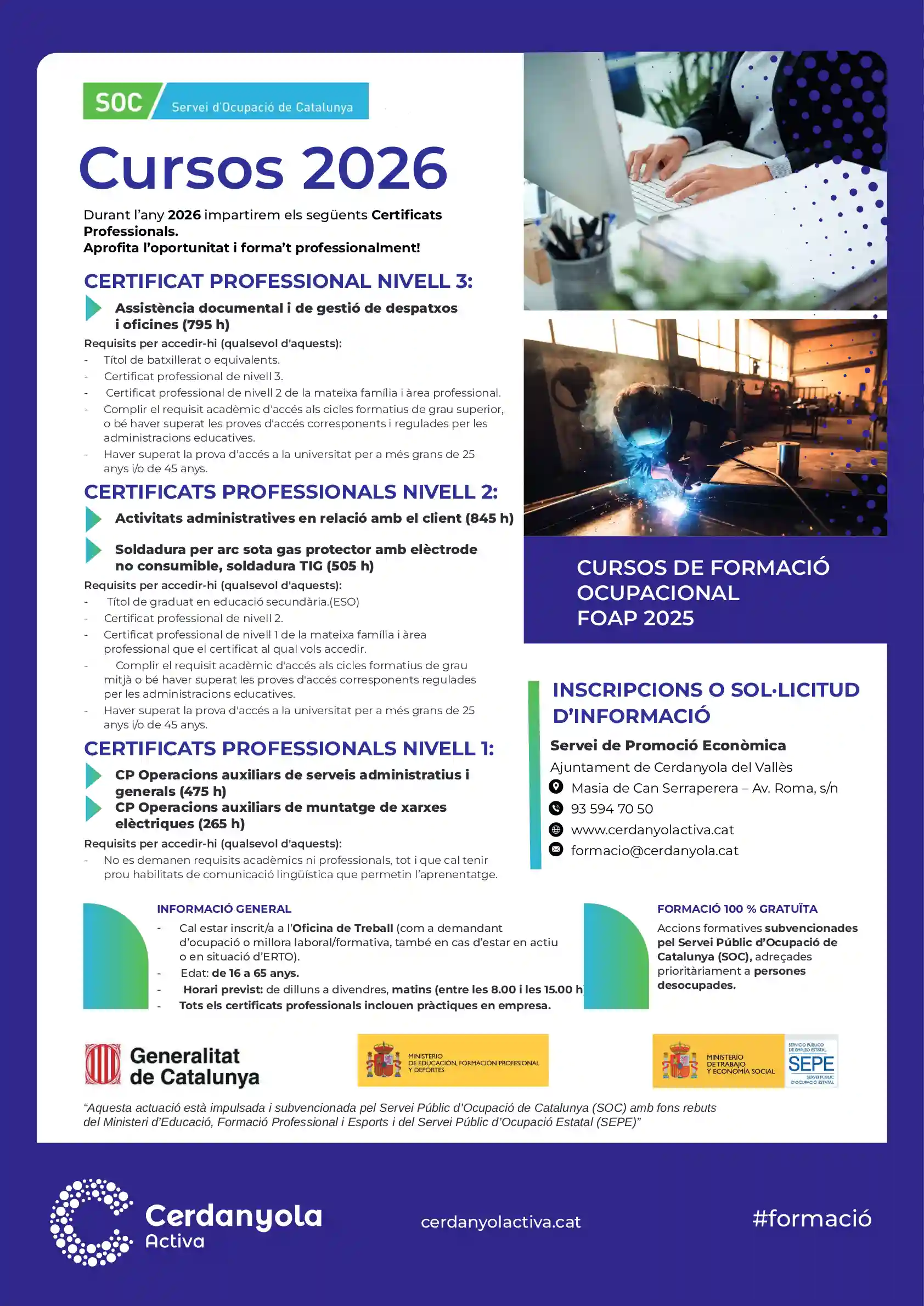 El Servei de Promoció Econòmica de l’Ajuntament de Cerdanyola del Vallès ha obert la convocatòria de formació ocupacional FOAP 2025, adreçada prioritàriament a persones en situació d’atur, amb l’objectiu de millorar l’ocupabilitat i facilitar la inserció laboral mitjançant formació oficial i pràctica.