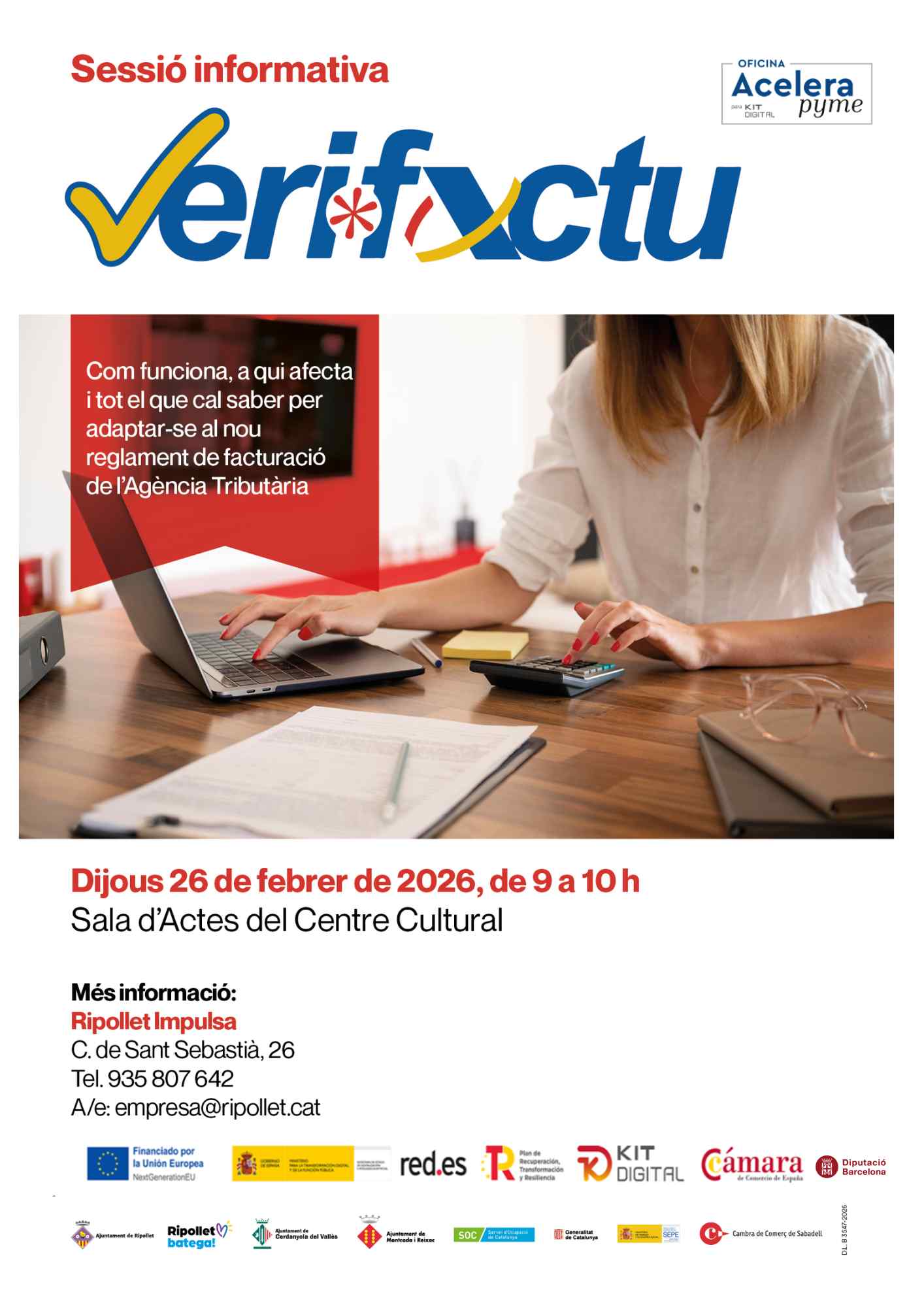Els ajuntaments de Ripollet, Cerdanyola del Vallès i Montcada i Reixac organitzen conjuntament una sessió informativa sobre la nova normativa Verifactu, el sistema promogut per l’Agència Tributària que regularà l’enviament automàtic i segur de les factures en temps real. L’acció s’adreça a persones autònomes, emprenedores i empreses que vulguin conèixer de primera mà com els afectarà aquest nou marc normatiu i com preparar-se adequadament.